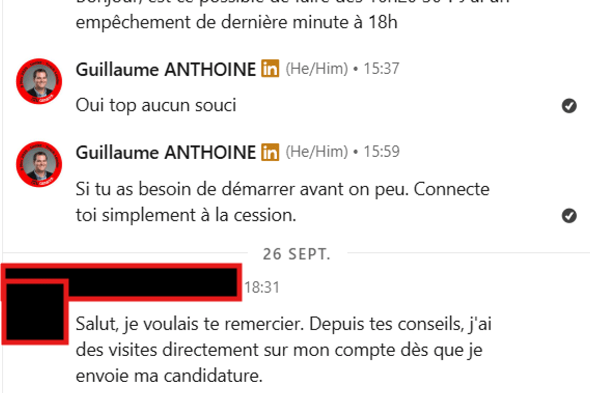 Salut ! C'est la folie ! Hahaha ! J'ai reçu 5 mails en 3 jours d'Enterprise différentes pour le même poste. Je pense que tes techniques ont trop bien fonctionnées ^^. Je comprends pourquoi la 1ère entreprise a rapidement demandé un contrat d'exclusivité car les recruteurs sont à l'affut !